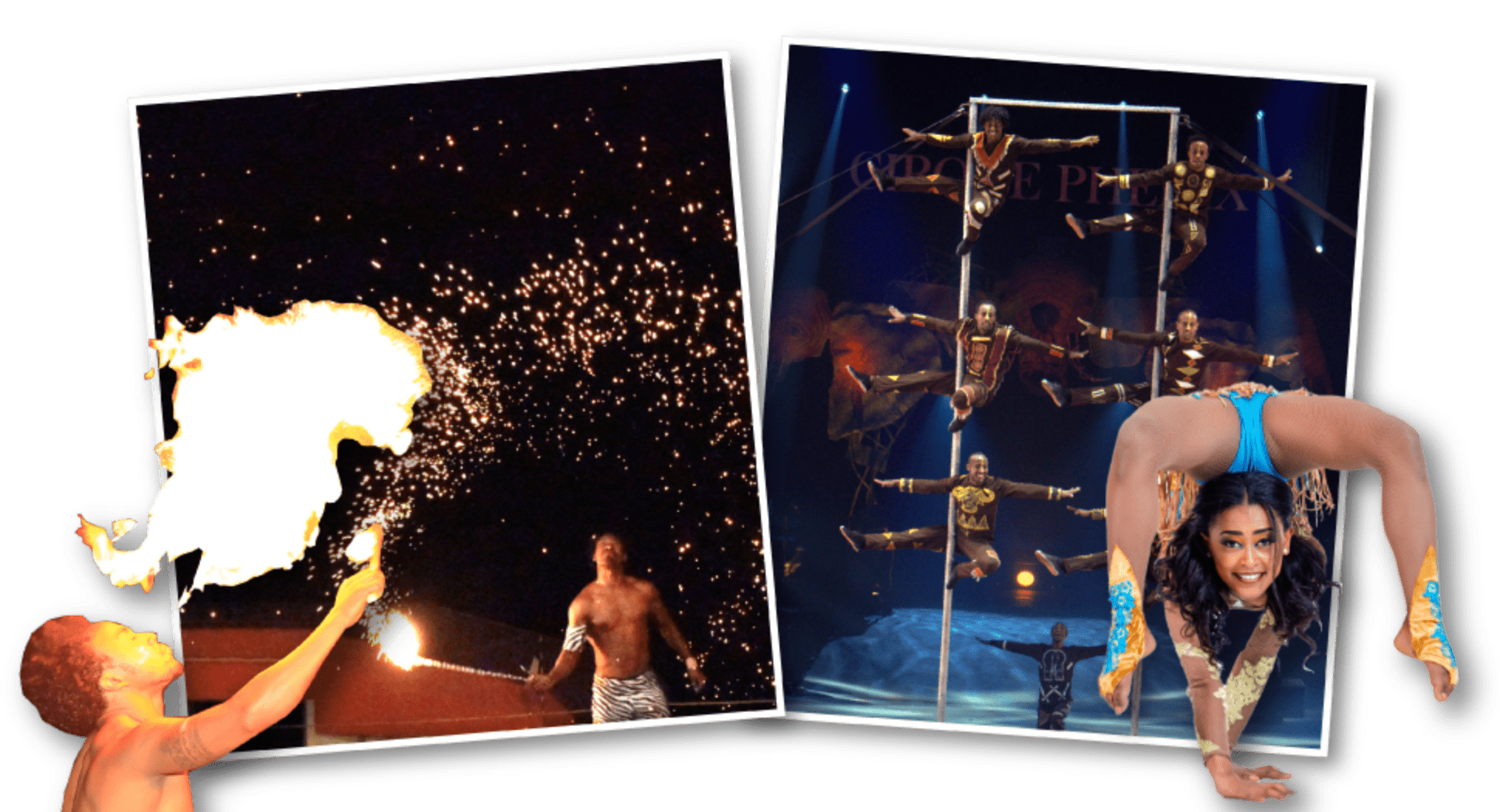 夜には炎を自在に操るエネルギッシュなファイヤーショーを間近で。